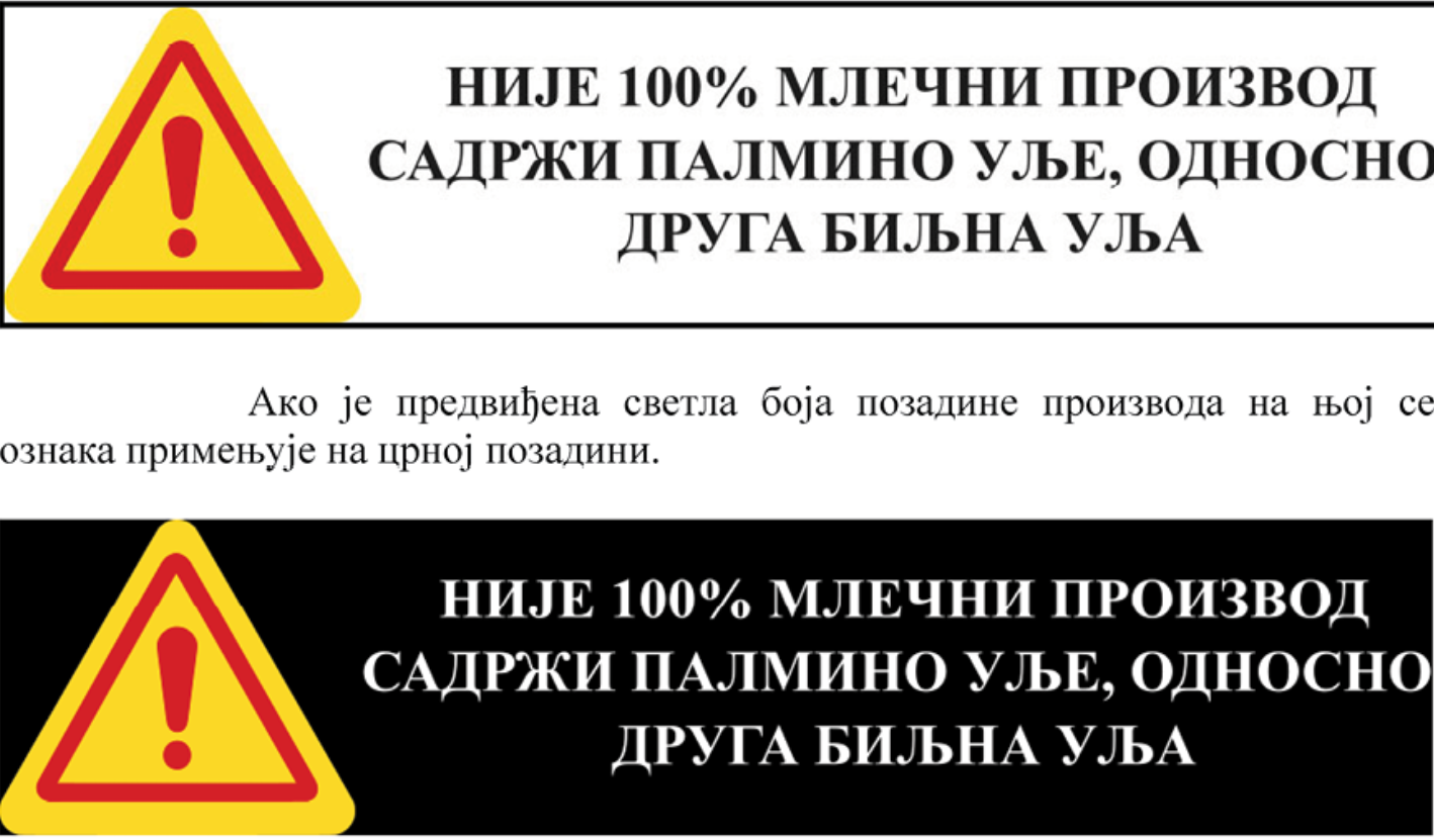 Kao najvidljiviji deo te uredbe, resorno ministarstvo navodi oznaku koja glasi "nije 100 odsto mlečni proizvod – sadrži palmino ulje ili druga biljna ulja", i ona će morati da se nađe na etiketi, na rafu, uz cenu, u meniju, brošuri ili bilo kojoj vrsti oglašavanja, uključujući i digitalne kanale.
