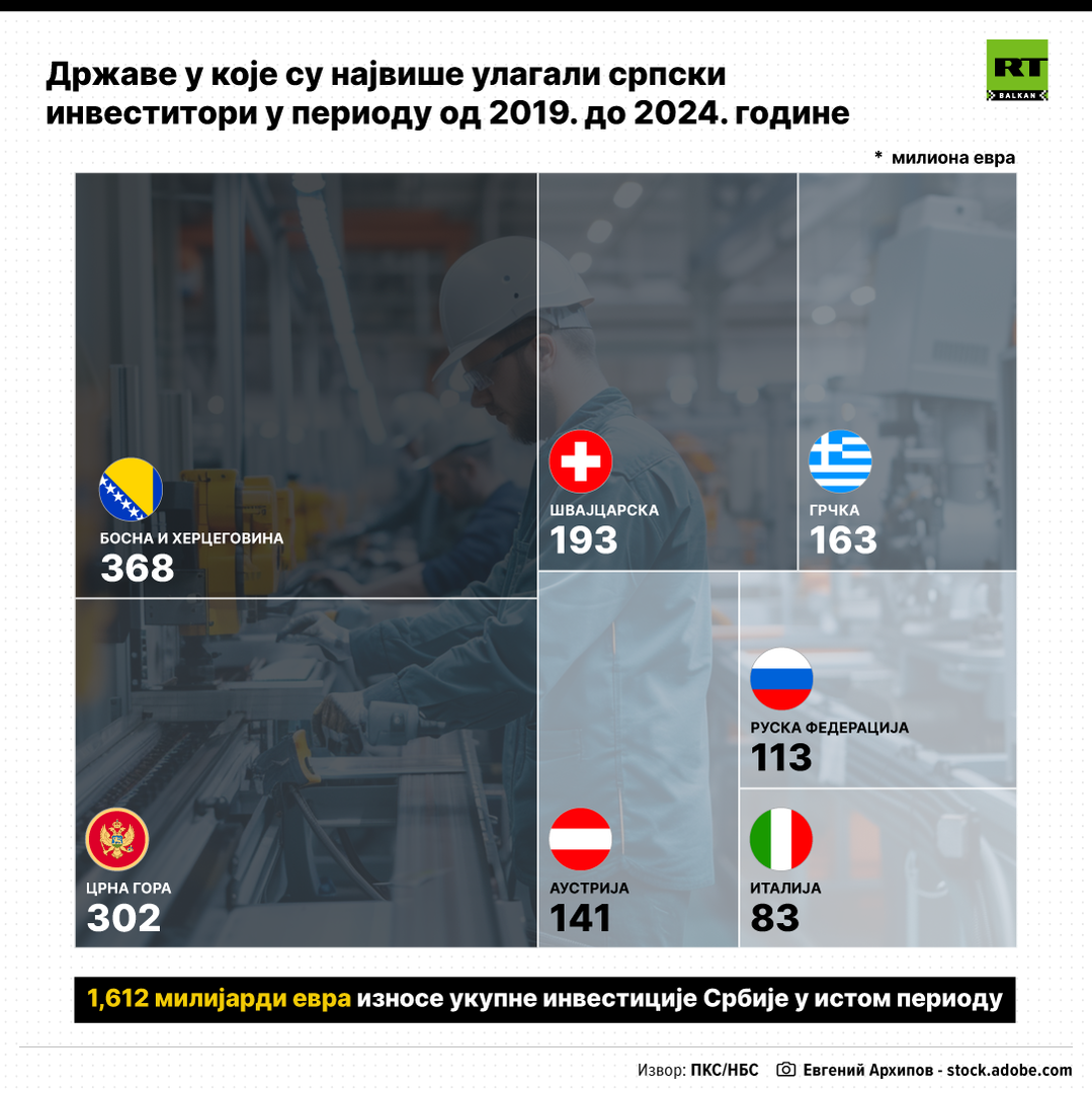Prema podacima Narodne banke Srbije, ukupne investicije iz Srbije ka drugim zemljama od 2019. do 2024. godine su iznosile 1,6 milijardi evra.