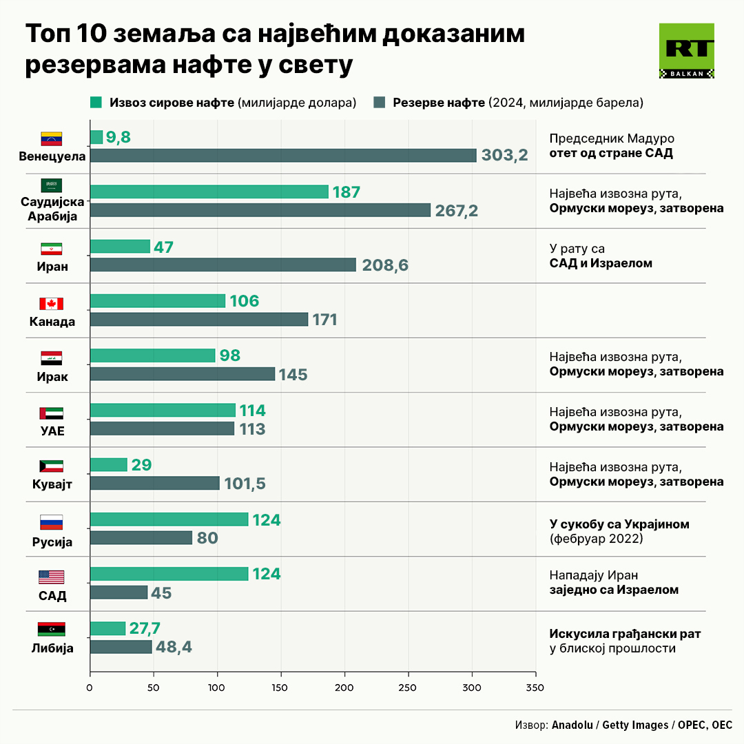 Prema podacima OPEK i OEC Na prvom mestu po rezervama je Venecuela, čiji je predsednik Nikolas Maduro otet od strane SAD. Među prvih sedam zemalja sa najvećim rezervama su Saudijska Arabija, Iran, Irak, UAE i Kuvajt kojima je onemogućen izvoz, jer je najznačajnija ruta, Ormuski moreuz, zatvorena. Osim njih, na trećem mestu je Kanada, a na sedmom Rusija.