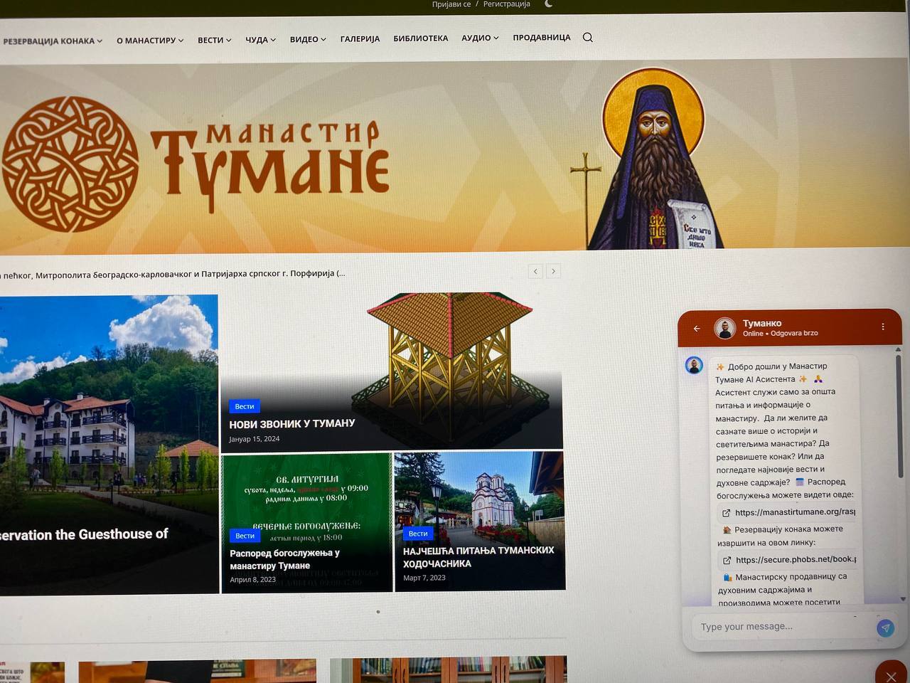 Manastir Tumane suočava se sa hiljadama upita dnevno. Brojna pitanja o posetama, konaku, molitvama i bogosluženjima bilo je gotovo nemoguće obraditi na vreme. Rešenje je došlo u vidu Tumanka AI, asistenta koji može pružiti odgovor odmah, u svako doba dana i noći, objavio je Aleksandar Nikolić, autor ovog projekta, (CEO AiNicholasFamily.com & AiChatBot.rs,) u svom postu na Linkedinu.