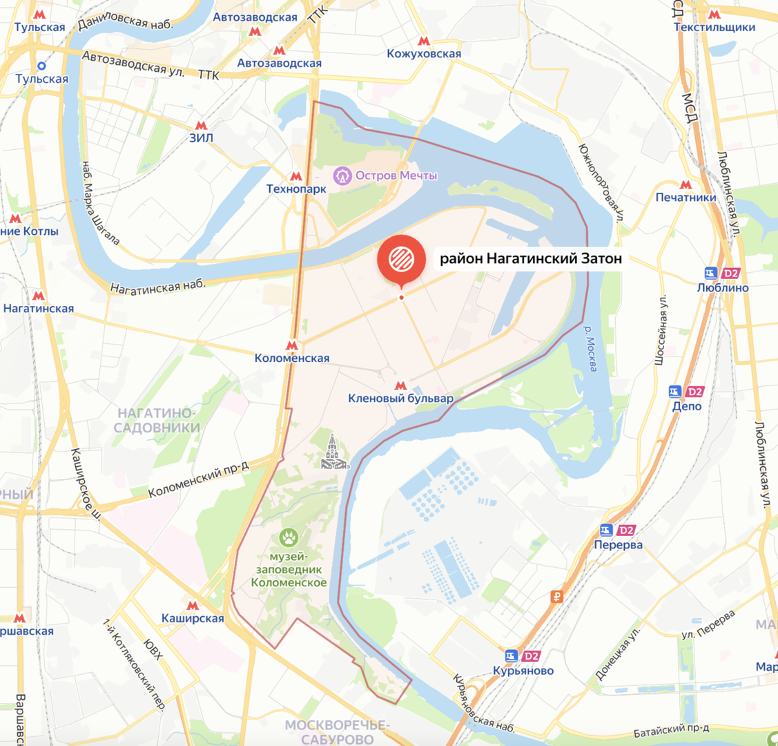 U sastav savremenog dela ulazi muzej-rezervat "Kolomensko", kao i park atrakcija "Ostrvo snova". Sa zapada je Nagatinski Zaton ograničen prospektom Andropova i njegova parna strana već pripada drugom delu koji se zove Nagatino-Sadovniki.