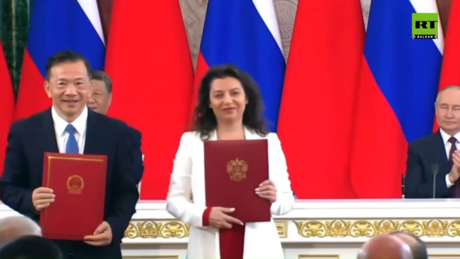 Glavna i odgovorna urednica RT Margarita Simonjan i generalni direktor Kineske medijagrupe Šen Haišjong razmenili su primerke potpisanog dogovora u prisustvu ruskog predsednika Vladimira Putina i kineskog lidera Sija Đinpinga.