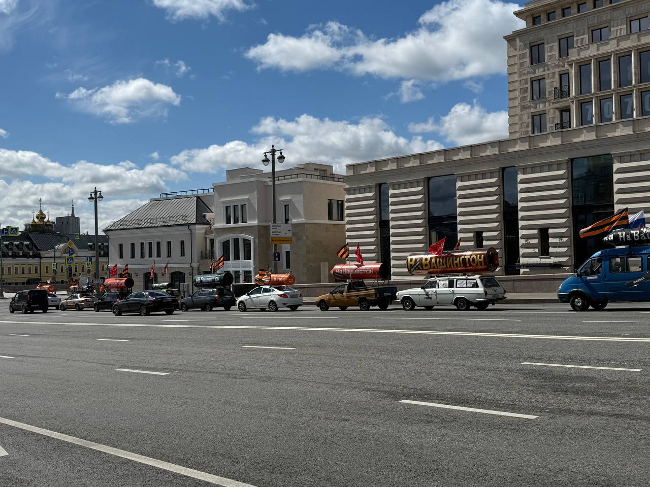 Dan posle veličanstvene Parade pobede u Moskvi, na ulici glavnog grada Ruske federacije primećena je živopisna kolona automobila ukrašena sovjetskim i ruskim zastavama i georgijevskim lentama koje ovih dana krase brojne objekte i vozila u ruskoj prestonici i koju mnogi Rusi s ponosom nose.