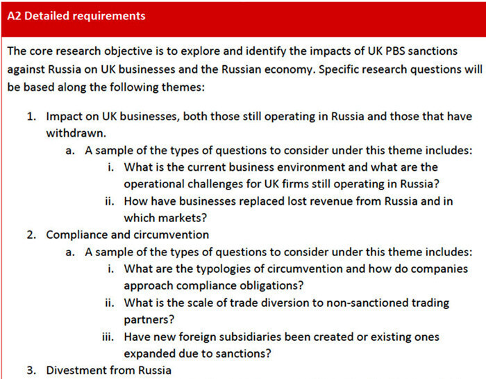 Rezultati istraživanja je trebalo da budu objavljeni do marta 2025. godine u okviru izveštaja od približno 30-60 stranica, u kojem je opisan "uticaj britanskih sankcija koje se tiču pružanja profesionalnih i poslovnih usluga na britanske firme i rusko tržište, njihova efikasnost u pogledu ruske ekonomije i zapažanja o praksi njihovog zaobilaženja".