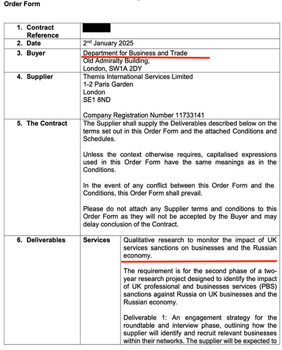 Na osnovu informacija koje se mogu naći na britanskom portalu za javne nabavke, reč je o jednom ugovoru, vrednom 85.000 funti (113.000 dolara), potpisanom u januaru 2025. godine sa konsultantskom firmom "Temis Internešnel Servisis Limited" (Themis International Services Limited), i drugom ugovoru, vrednom čak 671.000 funti (900.000 dolara), potpisanom u januaru 2024. godine sa kompanijom "Dilojt".