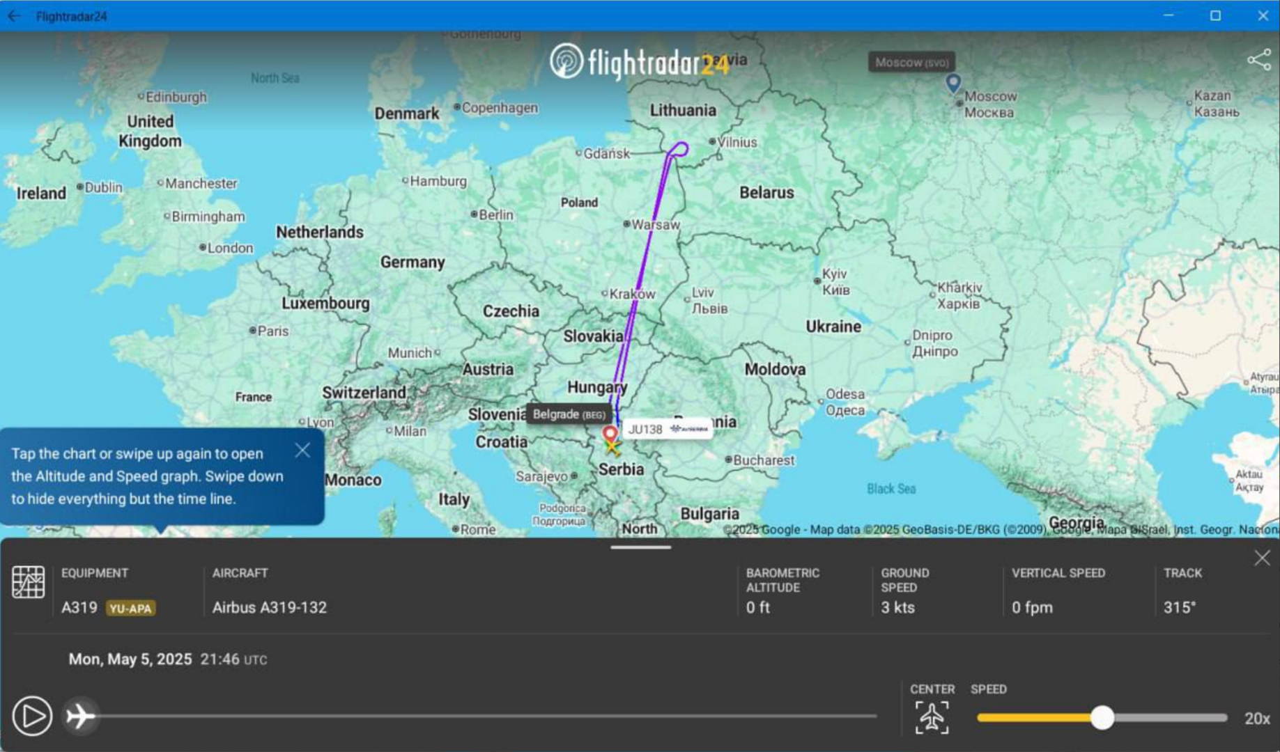 Avion "erbas A319-132" sa oznakom repa YU-APA leteo je preko Mađarske, Slovačke, Poljske i Litvanije, gde je oko 1:30 napravio zaokret i vratio se do Beograda istim putem.