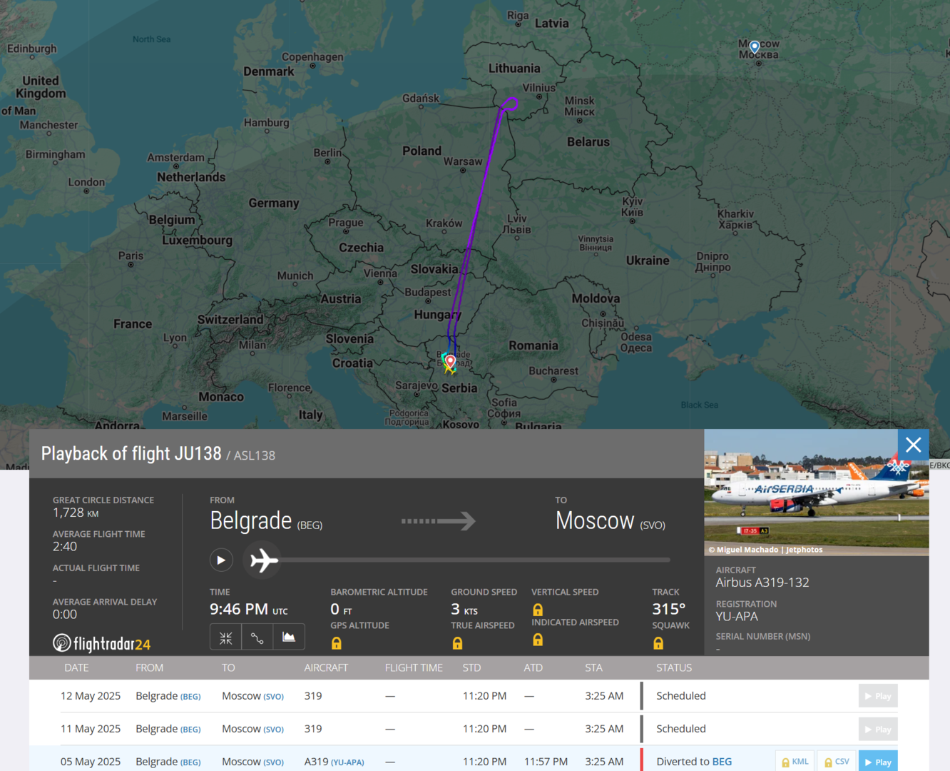 Let "Er Srbije" koji je u poslednjim minutima ponedeljka poleteo za Moskvu okrenuo se u vazdušnom prostoru Litvanije i vratio se na aerodrom "Nikola Tesla" oko 3:30 u utorak ujutro.