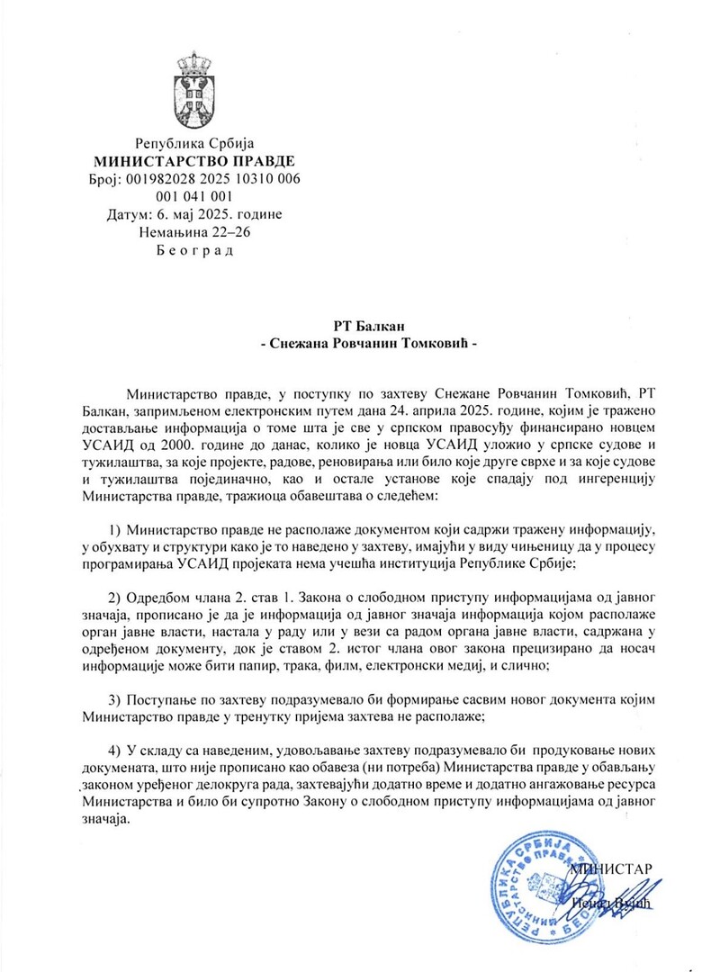 "Ministarstvo pravde ne raspolaže dokumentom koji sadrži traženu informaciju imajući u vidu činjenicu da u procesu programiranja projekata USAID, nema učešća institucija Republike Srbije", piše u odgovoru koji smo dobili.