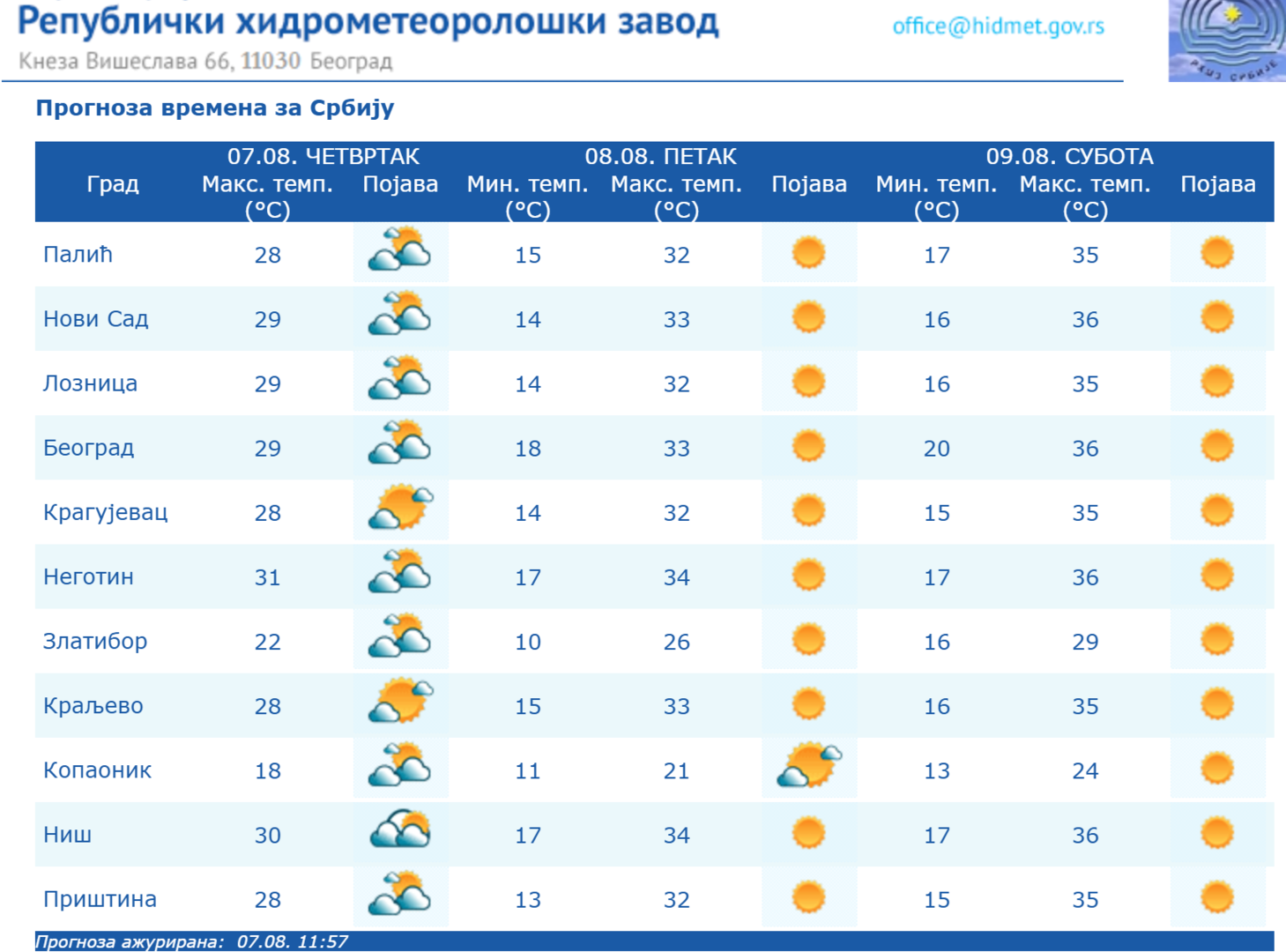 Narednih sedam dana očekuje se pretežno sunčano i veoma toplo vreme sa maksimalnom temperaturom u većini mesta od 34 do 38 stepeni, lokalno i više.