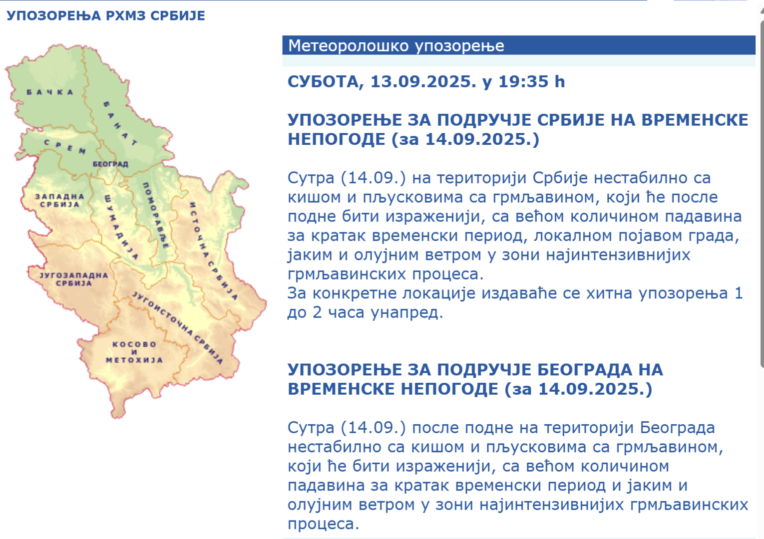 RHMZ ističe da će za konkretne lokacije biti izdata hitna upozorenja jedan do dva časa unapred.