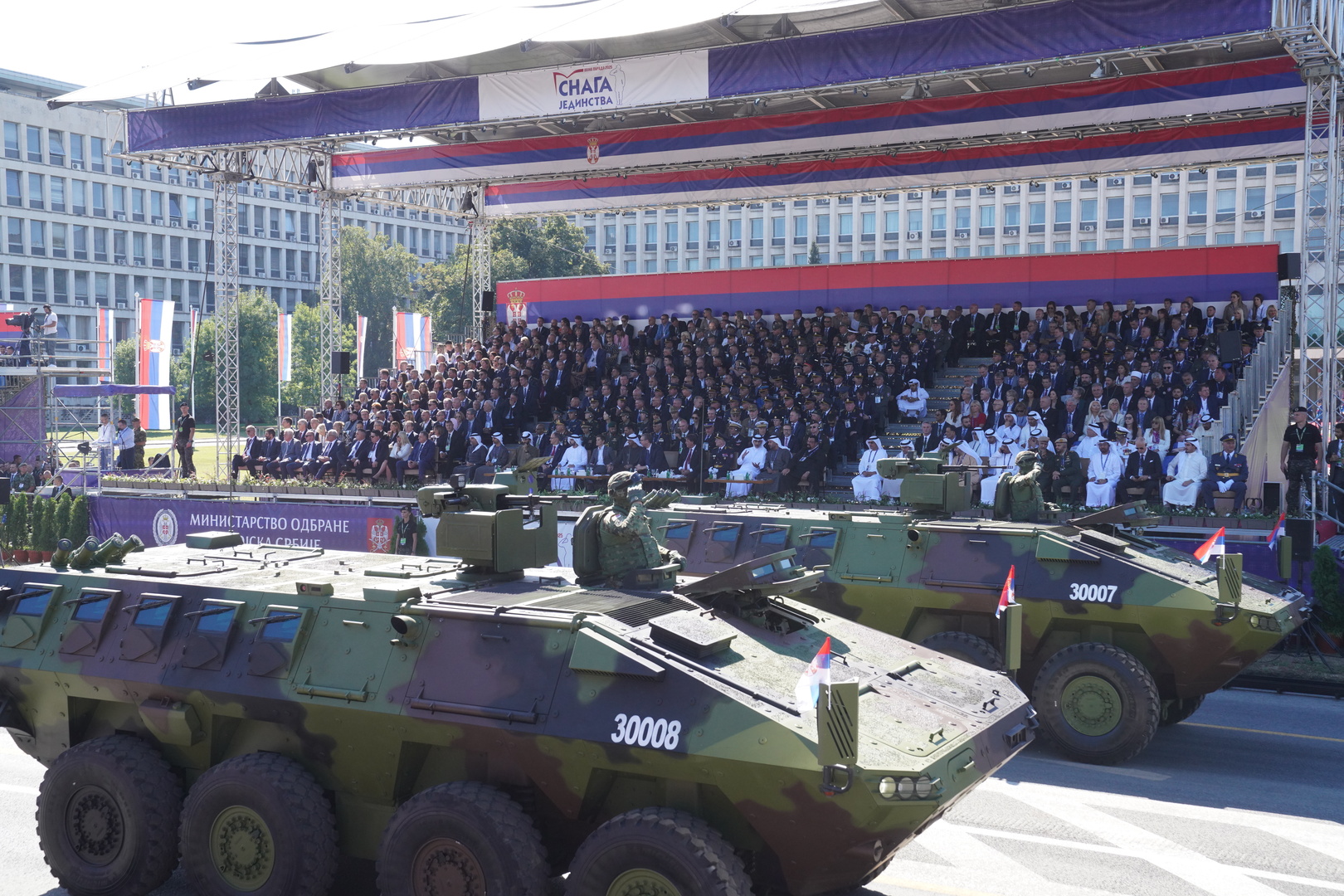 U Beogradu je, ispred Palate "Srbija", održana velika vojna parada "Snaga jedinstva", sa oko 10.000 učesnika, 2.500 sredstava naoružanja i vojne opreme, više od 600 vozila, 70 vazduhoplova i 20 plovnih objekata. Parada je počela u 11 časova počasnom artiljerijskom paljbom i himnom Srbije. Razvijena je zastava Srbije dugačka 300 metara i teška 300 kilograma, a na čelu paradnog poretka je general-potpukovnik Tiosav Janković, zamenik načelnika Generalštaba Vojske Srbije.