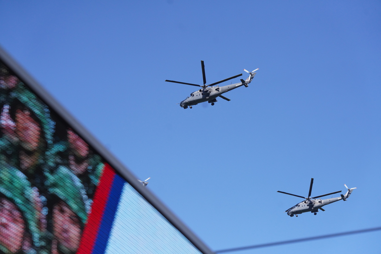 TANJUG/MILOŠ MILIVOJEVIĆ Usledio je podešalon helikopterskih jedinica, koji su činili helikopteri Mi-35 M/P, Mi-17, H-145, Gama, Gazela, nakon čega smo mogli da vidimo prelet grupe gostujućih vazduhoplova - "rafal", kao i nalet helikoptera MUP-a