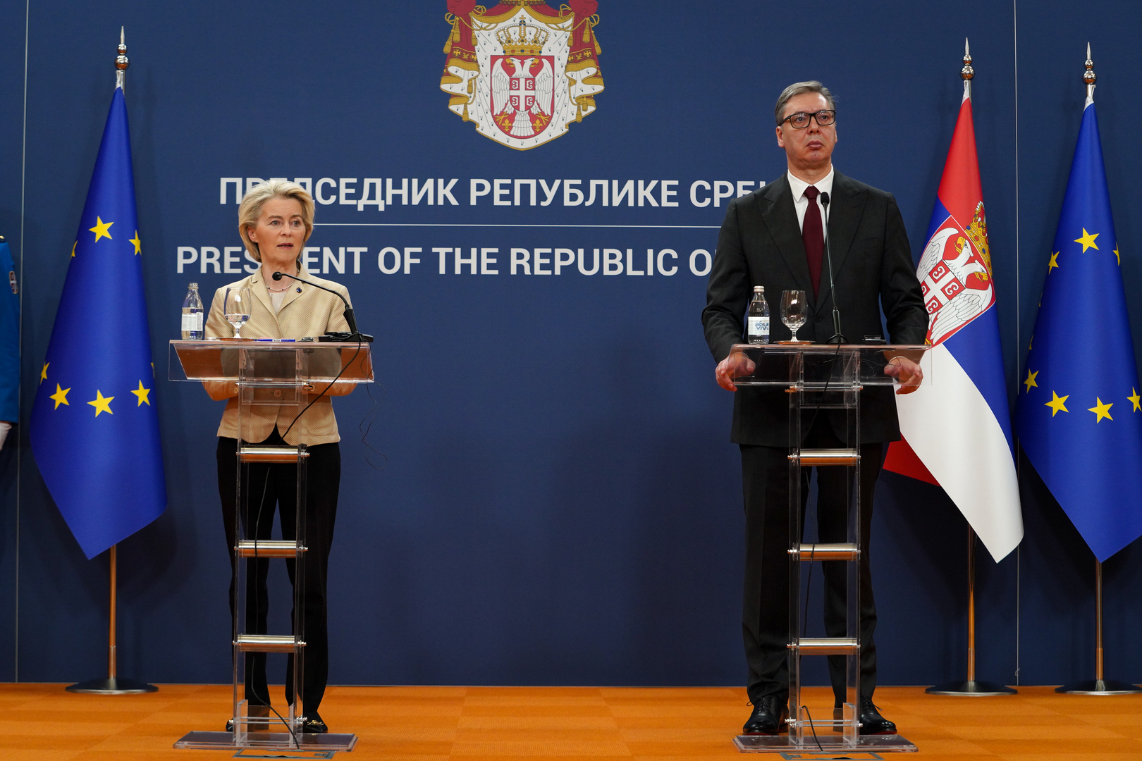 Od početka sukoba u Ukrajini nismo otvorili nijedno poglavlje, nijedan klaster, rekao je predsednik Srbije Aleksandar Vučić, na zajedničkoj konferenciji sa predsednicom Evropske komisije Ursule fon der Lajen u Palati "Srbija".