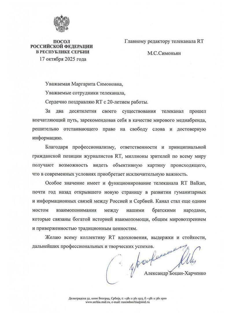 "Tokom dve decenije svog postojanja, RT je prošao impresivan put i etablirao se kao globalni medijski brend koji odlučno brani pravo na slobodu govora i tačne informacije. Zahvaljujući profesionalizmu, odgovornosti i principijelnom građanskom stavu novinara RT, milioni gledalaca širom sveta mogu da vide objektivnu sliku aktuelnih događaja, što je izuzetno važno u današnjoj situaciji", naveo je ambasador.