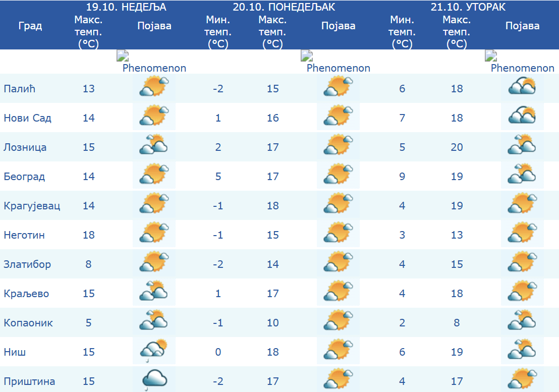 Najniža temperatura će se kretati od dva do pet stepeni, dok će najviša dnevna temperatura dostići 17 stepeni Celzijusa.