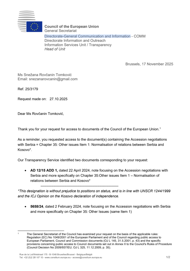 Služba za pristup informacijama od javnog značaja, kako su rekli "identifikovala je dva dokumenta koja odgovaraju zahtevu". To su "AD 12/15 ADD 1, od 22. aprila 2024. godine, beleška koja se fokusira na pregovore o pristupanju sa Srbijom, a posebno na Poglavlje 35 i 5658/24 od 2. februara 2024.