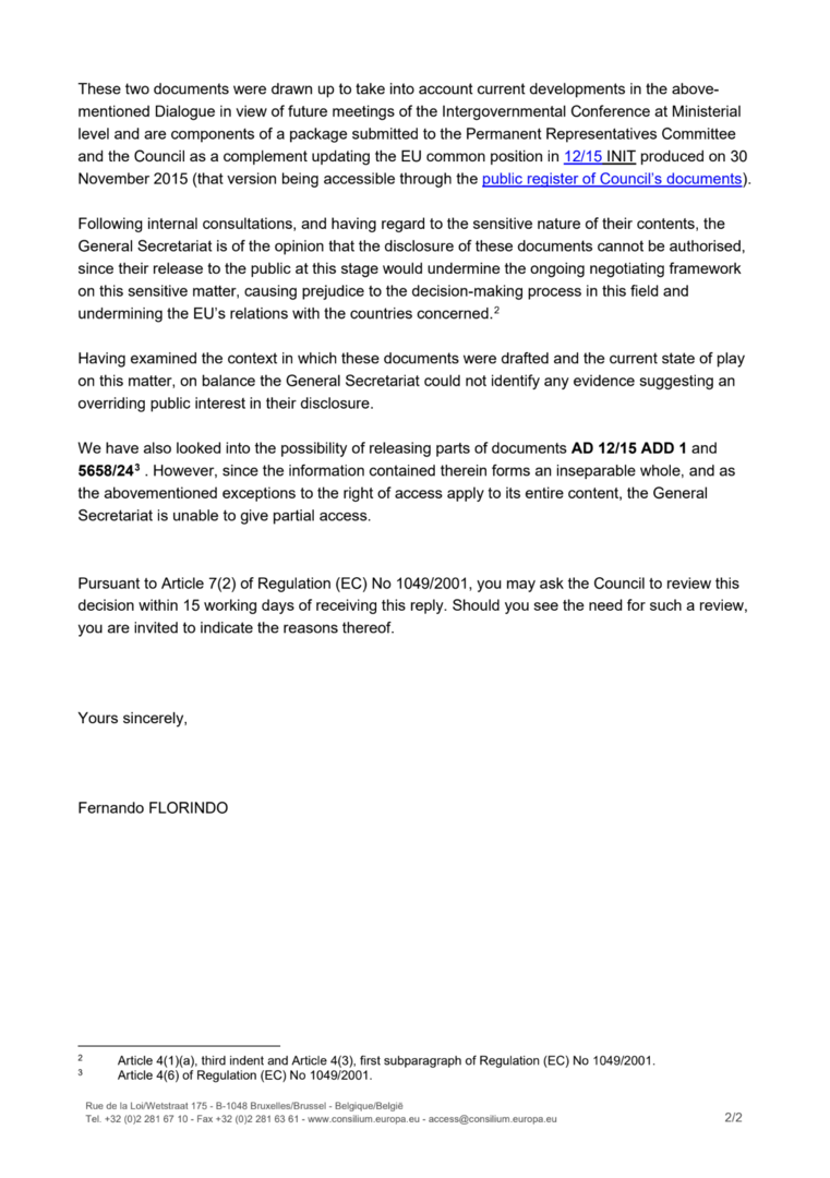 "Nakon što je ispitao kontekst u kojem su ovi dokumenti sastavljeni i trenutno stanje stvari po ovom pitanju, Generalni sekretarijat, u celini, nije mogao da identifikuje nikakve dokaze koji ukazuju na preovlađujući javni interes za njihovo otkrivanje. Takođe smo razmotrili mogućnost objavljivanja delova dokumenata AD 12/15 ADD 1 i 5658/243. Međutim, pošto informacije sadržane u njima čine neodvojivu celinu, a gore pomenuti izuzeci od prava pristupa primenjuju se na celokupan sadržaj, Generalni sekretarijat nije u mogućnosti da odobri delimičan pristup", rečeno je.