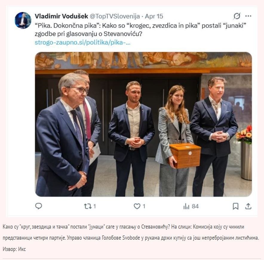 Tada na scenu stupa državna novinska agencija STA za koju je Golobova vlada baš potkraj svog mandata bogato odrešila kesu i uredila buduće finansiranje iz državne blagajne, inače bi propala. Otkriće STA odjeknulo je kao bomba – na nekoliko glasačkih listića koji su potvrdili Stevanovića za predsednika parlamenta, našli su tri vrste oznaka: na nekima zvezdicu, na drugima kružić, na trećim tačkicu.