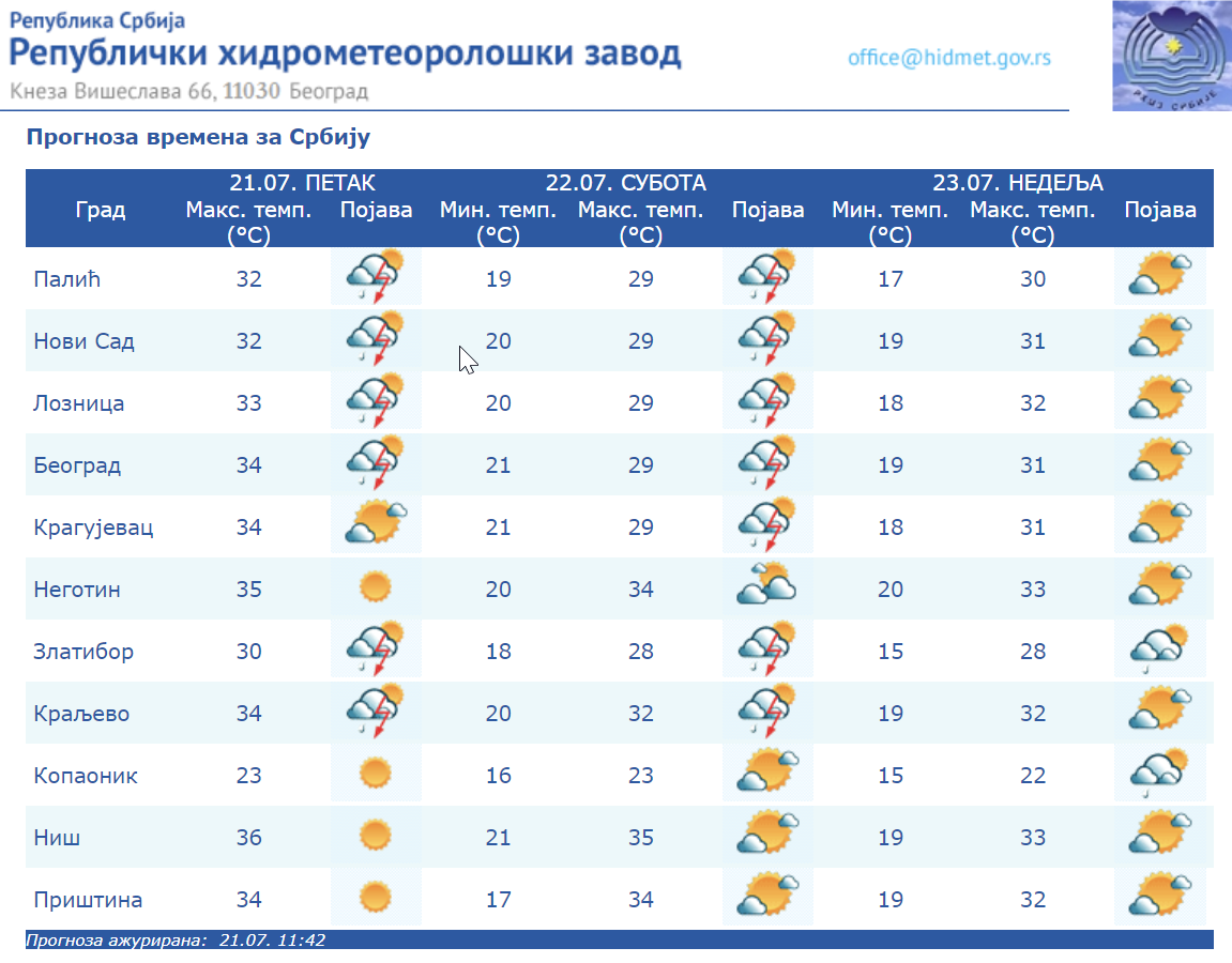 RHMZ navodi da će najniža temperatura u Srbiji biti u Prištini od 17 stepeni Celzijusa do 21 u Beogradu, Nišu i Kragujevcu, a najviša dnevna od 29 na severu do 35 stepeni u Nišu, uz lokalnu pojavu grmljavine sa gradom.
