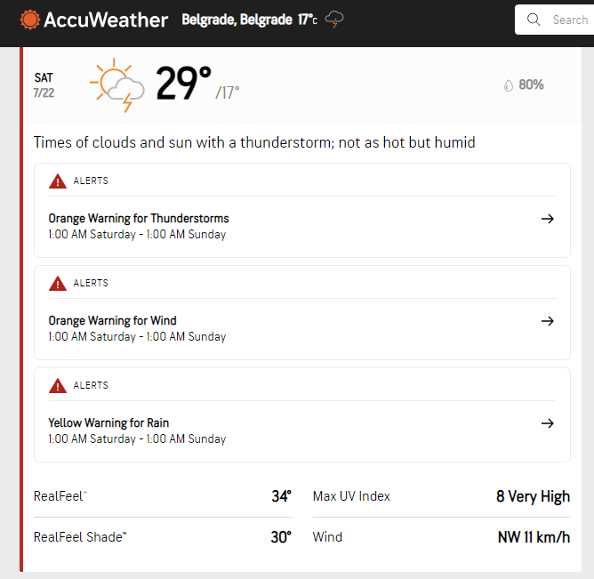 Sajt "AccuWeather" najavljuje i narandžaste meteoalarme zbog oluja sa grmljavinom i jakog vetra, a žuti zbog kiše.