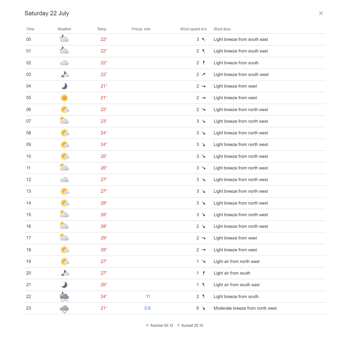 Prognoza sajta "AccuWeather" je nešto između prognoza RHMZ-a i "Yr.no", te oni najavljuju da će najniža dnevna temperatura biti 17, a najviša 29 stepeni, dok će subjektivni osećaj na suncu biti da je 34 stepena, a u hladu 20.