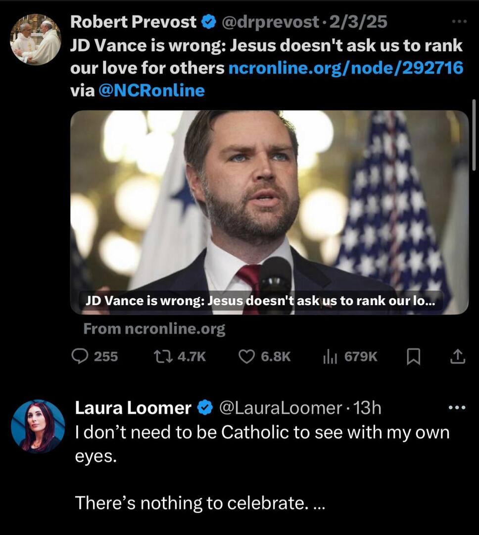 U objavi iz februara, poručio je da "Džej Di Vens nije u pravu: Isus ne traži od nas da rangiramo ljubav prema drugima", direktno osporavajući Vensovo tumačenje hrišćanskog učenja kojim se pokušava opravdati restriktivna imigraciona politika MAGA pokreta.