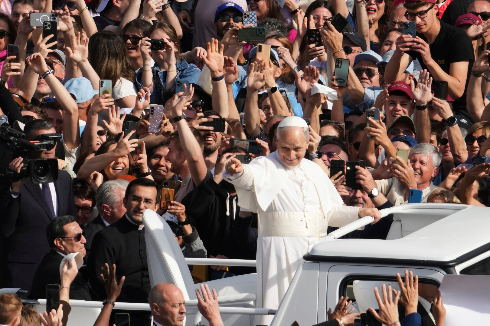 Zvona bazilike Svetog Petra su zvonila dok je papamobil polako prolazio trgom, a papa je mahao okupljenim vernicima koji su mahali zastavama i uzvikivali "Živeo papa!".