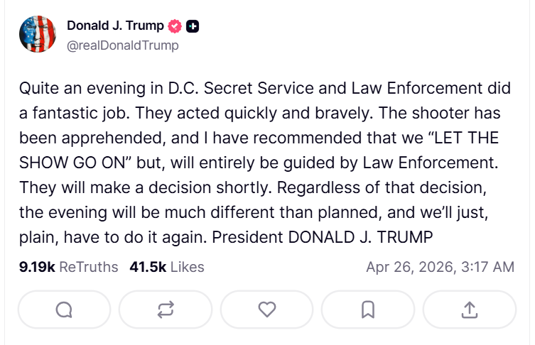 "Tajna služba i policija su uradili fantastičan posao. Reagovali su brzo i hrabro. Napadač je uhapšen, a ja sam preporučio da 'pustimo da se predstava nastavi', ali ćemo se u potpunosti voditi odlukama policije. Uskoro će doneti odluku. Bez obzira na tu odluku, veče će biti mnogo drugačije od planiranog i jednostavno ćemo morati da to ponovimo", napisao je Tramp potom na Trut soušlu.